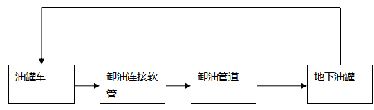 卸油工藝:油罐車行駛至加油站內(nèi)密封卸油口停車處,利用油罐車與地下儲(chǔ)油罐的高位差,采用密閉式卸油。采用油氣回收系統(tǒng),在油罐車卸油過(guò)程中,將原來(lái)儲(chǔ)油罐內(nèi)散溢的油氣,通過(guò)油氣回收地下工藝管線及卸車軟管重新收集至油罐車內(nèi),實(shí)現(xiàn)卸油與油氣等體積置換。其工藝流程如下圖:
